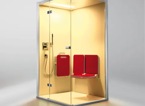 Weil in die Body + Soul die Dusche integriert ist, passt die Dampfdusche auch in kleine Bäder. Die extraschmale Dampfbox und die klappbaren Sitz machen das Dampfbad zu einer geräumigen Dusche.