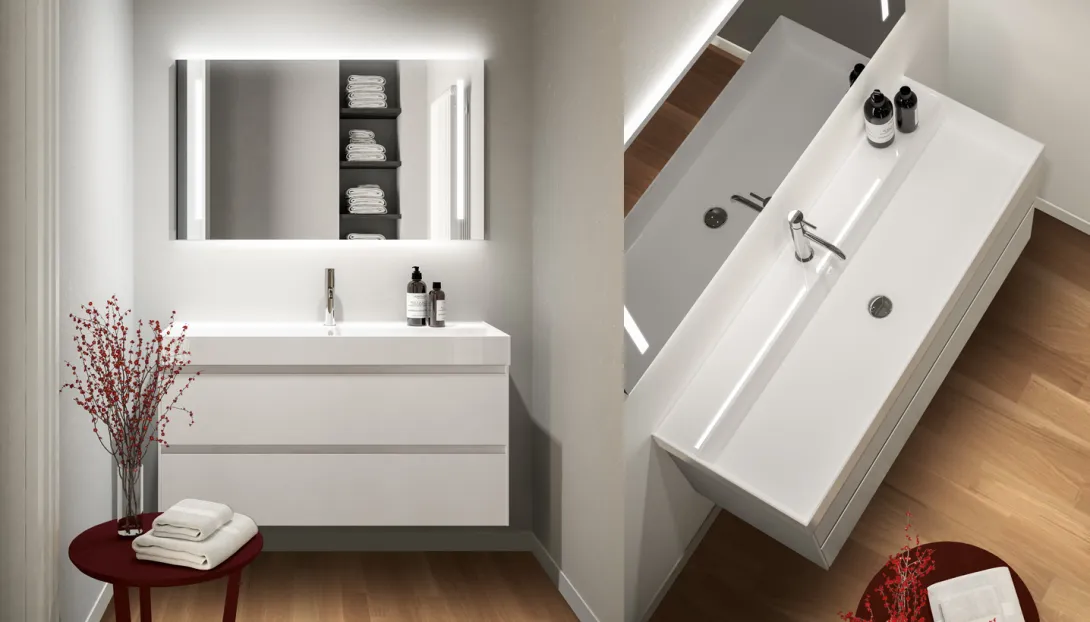 Ein schlankes Seitenprofil zeichnet eine feine Kontur entlang des Schranks und verleiht der Kollektion ihre unverwechselbare Signatur. In Kombination mit hohen Waschtischen oder Waschtischplatten aus Keramik, Ceramilux oder Mineralmarmo entsteht ein stimmiges Gesamtbild mit hohem funktionalem Anspruch.