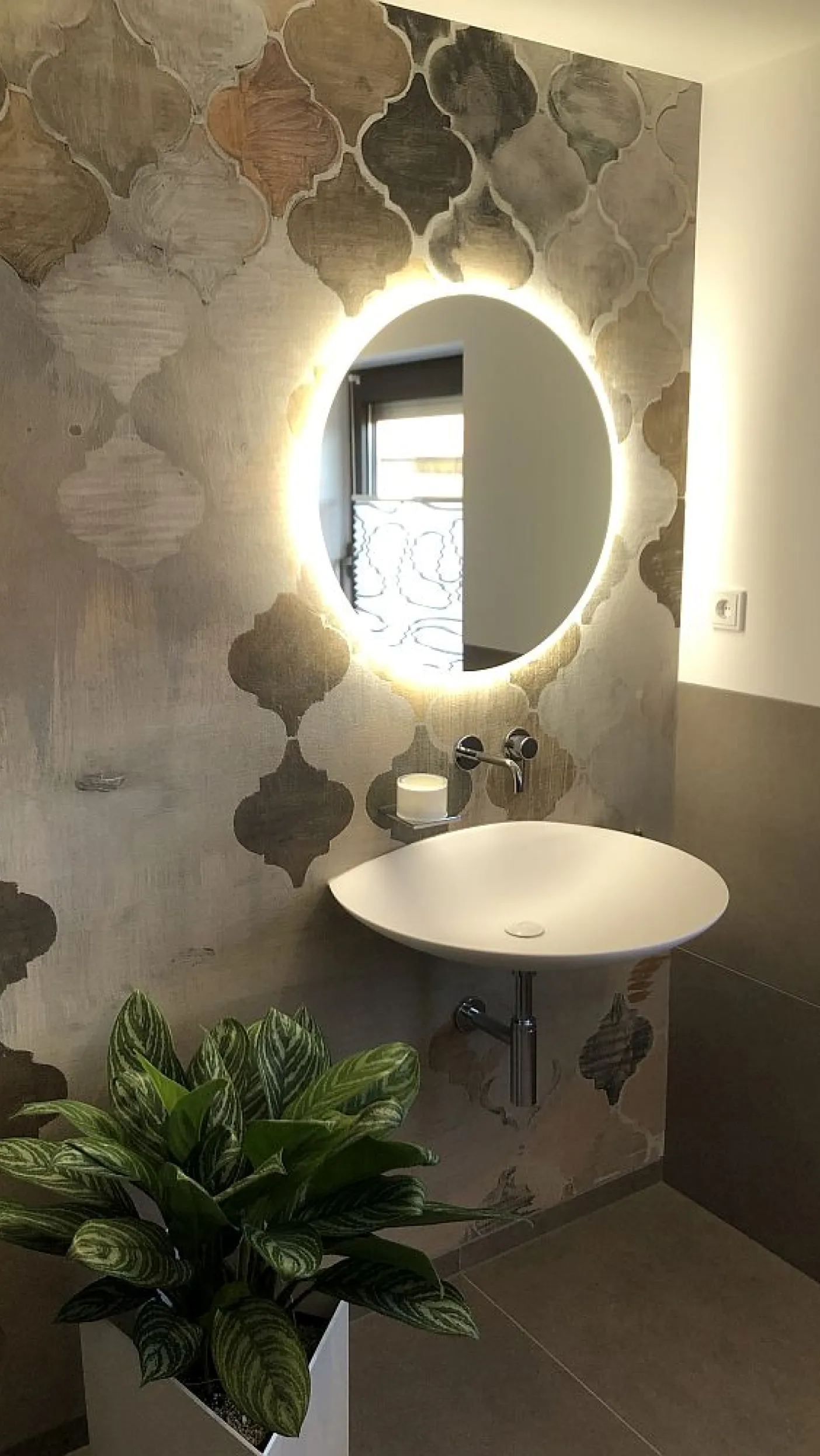 Hochwertiges Gäste-WC mit stilvoller Wandgestaltung und Leuchtspiegel in Haßfurt